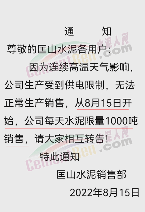 匡山水泥通知,从8月15起公司每天水泥限量1000吨销售。
