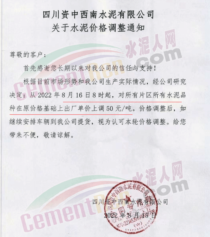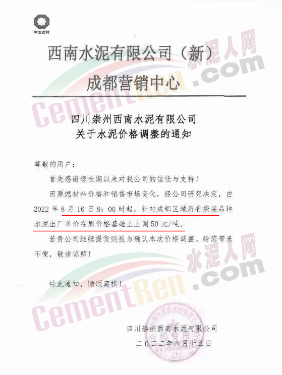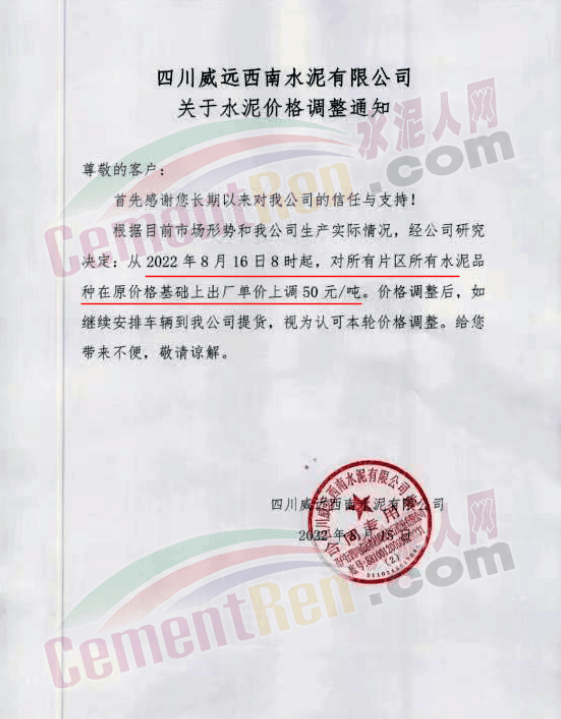 四川威远西南水泥有限公司通知,根据目前市场形势和我公司生产实际情况,经公司研究决定,从2022年8月16日8时起,对所有片区所有水泥品种在原价格基础上出厂单价上调50元/吨。价格调整后,如继续安排车辆到我公司提货,视为认可本轮价格调整。