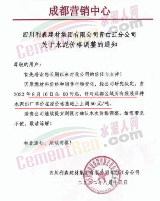 四川利森建材青白江分公司通知,8月16日8时起针对成都区域所有袋装品种水泥出厂单价上调50元/吨。