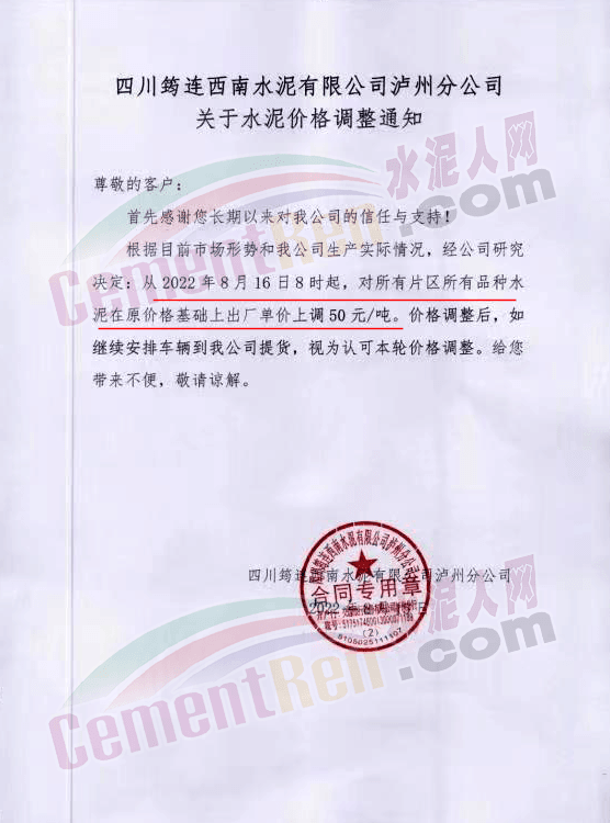 四川筠连西南水泥有限公司泸州分公司通知,根据目前市场形势和我公司生产实际情况,经公司研究决定,从2022年8月16日8时起,对所有片区所有品种水泥在原价格基础上出厂单价上调50元/吨。价格调整后,如继续安排车辆到我公司提货,视为认可本轮价格调整。