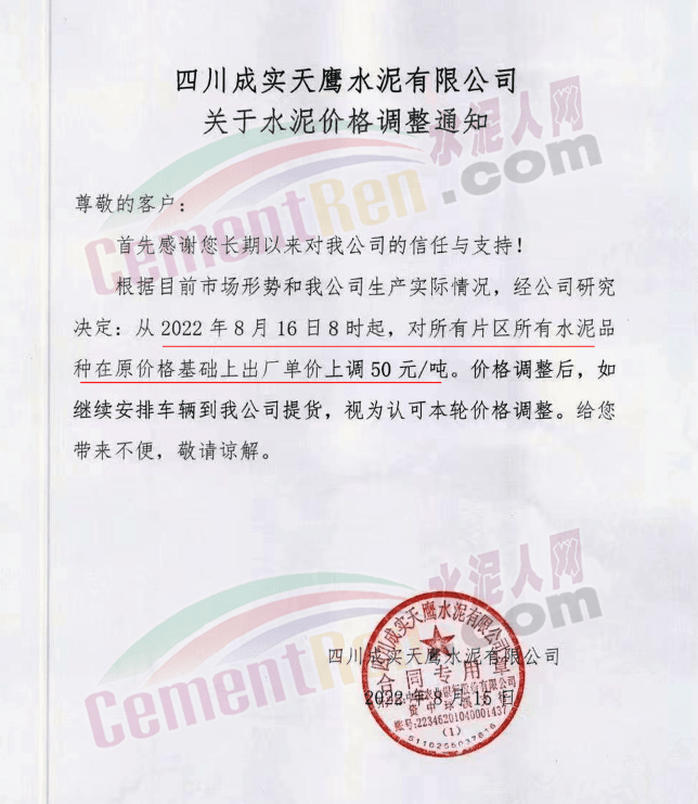 四川成实天鹰水泥通知,自8月16日8时起,对所有片区所有水泥品种在原价基础上上调50元/吨。
