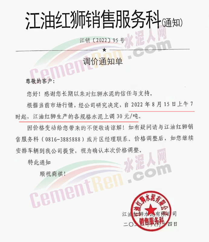江油红狮销售服务科通知,根据当前市场行情,经公司研究决定,自2022年8月15日上午7时起,江油红狮生产的各规格水泥上调30元/吨。价格调整后,如您继续安排车辆到我公司提货,视为确认本次价格调整。