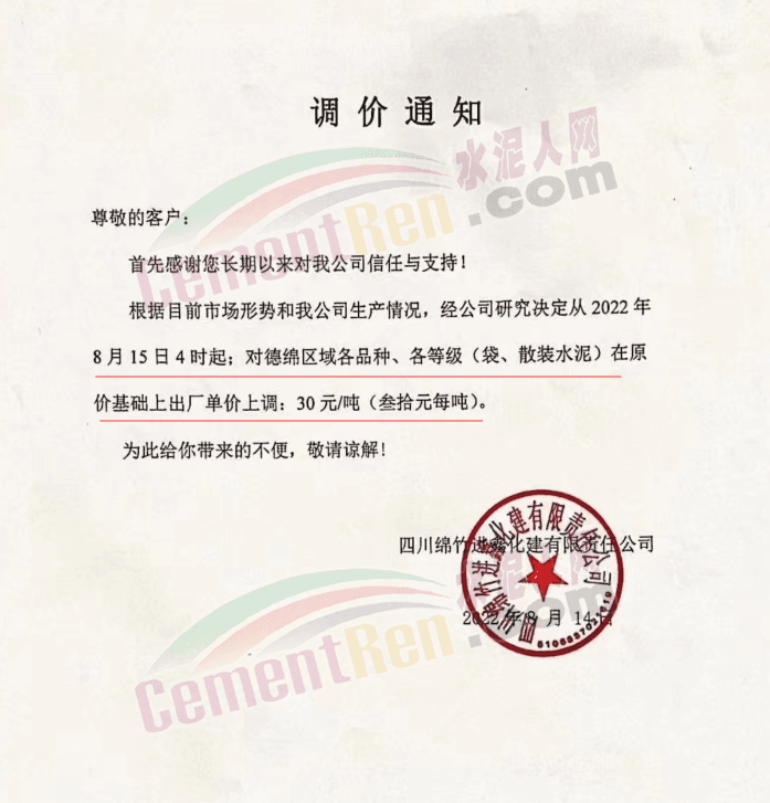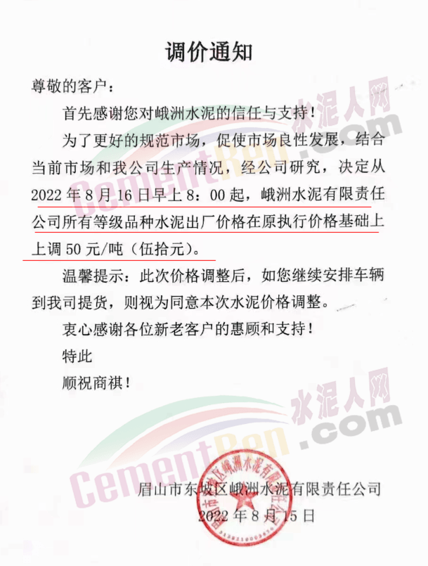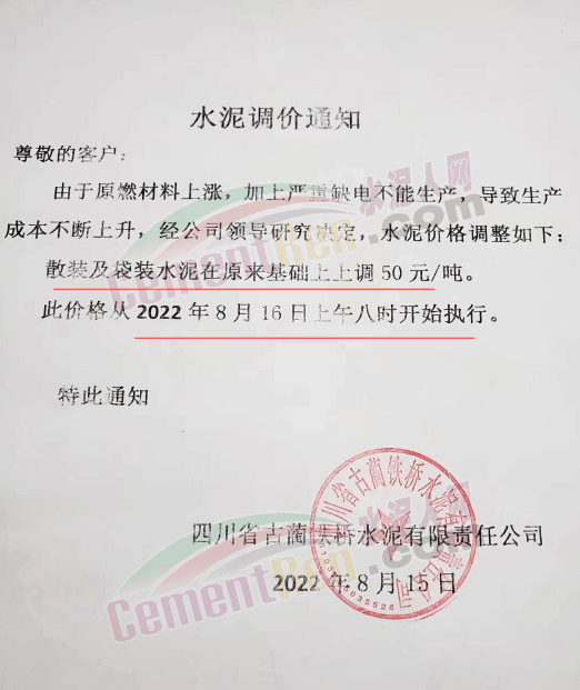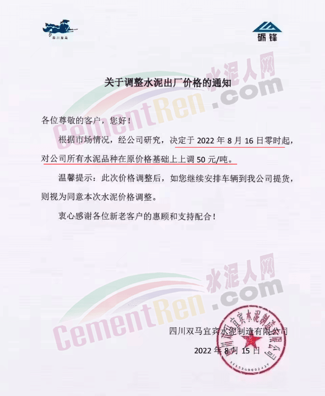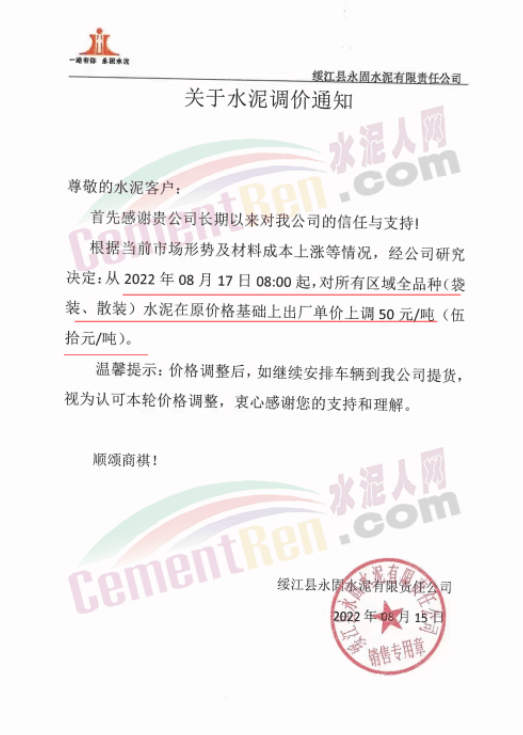 绥江永固水泥有限责任公司通知,从2022年08月17日08:00起,对所有区域全品种(袋装、散装)水泥在原价格基础上出厂单价上调50元/吨。