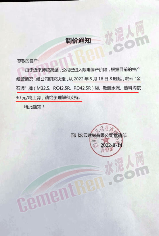 四川宏云建材有限公司营销部通知,由于近期持续高温,公司已进入限电停产阶段,根据目前的生产经营情况,经公司研究决定,从8月16日起,宏云“金石通”牌袋散装水泥、熟料均按30元/吨上调。