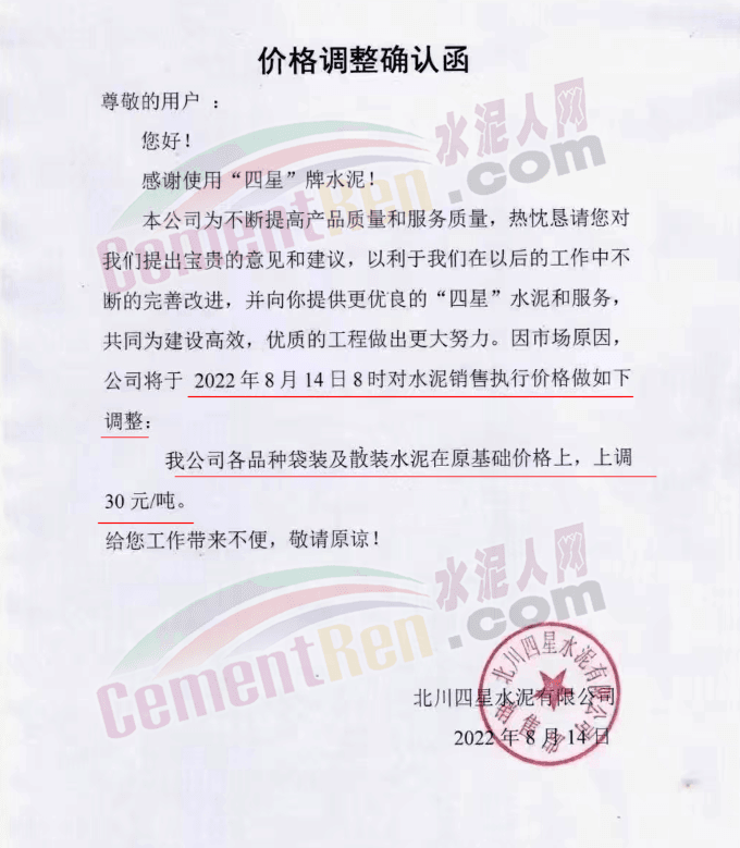 北川四星水泥通知,8月14日8时上调各品种袋装及散装水泥价格30元/吨。