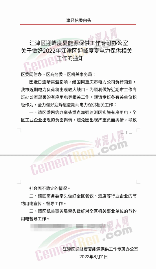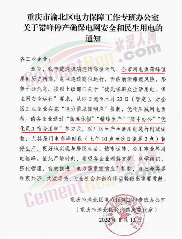 重庆市渝北区电力保障工作专班办公室发布《关于错峰停产确保电网安全和民生用电的通知》给各工业企业称,近期,重庆市遭遇极端连晴高温天气,全市用电负荷峰值屡创历史新高,电网连续高位运行,面临崩溃瘫痪风险,形势十分危急。按照上级部门关于“优先保群众生活用电、保主网安全运行”要求,从即日起至本月22日(暂定),对全区工业企业实施“电力需求侧响应”机制,优化压减用电负荷。请各企业通过“高温休假”“错峰生产”“集中办公”“优化员工宿舍用电”等方式,对厂区生产生活用电进行削减调整,尤其是用电高峰时段(上午10点至次日凌晨2点)暂停生产,更好地实现与居民生活、城市运转、公用事业等用电错峰。