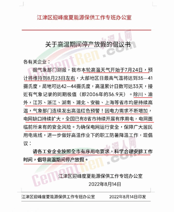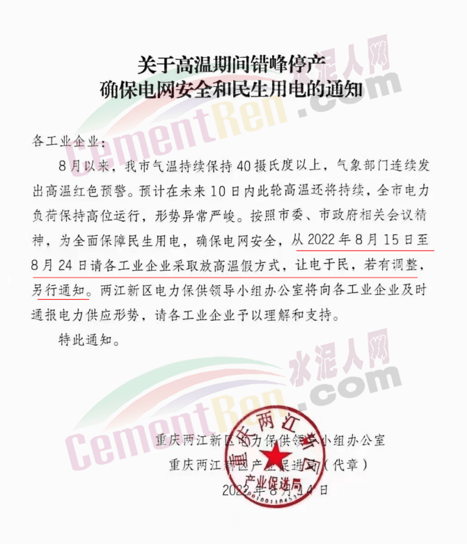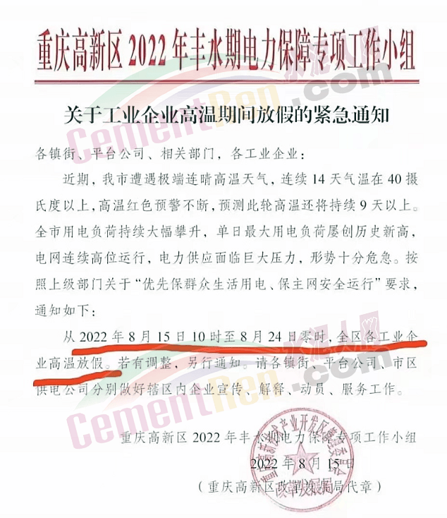 重庆两江新区《关于高温期间错峰停产确保电网安全和民生用电的通知》称,8月以来,我市气温持续保持40摄氏度以上,气象部门连续发出高温红色预警。预计在未来10日内此轮高温还将持续,全市电力负荷保持高位运行,形势异常严峻。按照市委、市政府相关会议精神,为全面保障民生用电,确保电网安全,从2022年8月15日至8月24日请各工业企业采取放高温假方式,让电于民,若有调整,另行通知。两江新区电力保供领导小组办公室将向各工业企业及时通报电力供应形势,请各工业企业予以理解和支持。