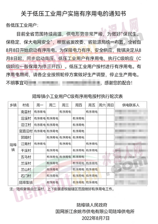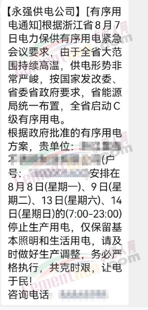 8月初,浙江省发改委发布《关于同意启动C级有序用电的函》给国网浙江电力有限公司称,经请示省政府同意,浙江省8月8日根据用电缺口实际情况启动C级1250万千瓦有序用电措施,8月9日再视情况调整有序用电等级。请认真做好有序用电细化措施,压实各地责任,确保民生用电,绝不能拉闸限电。