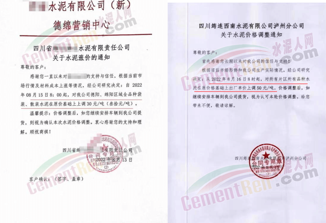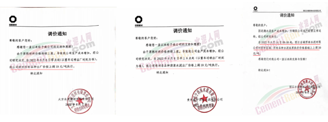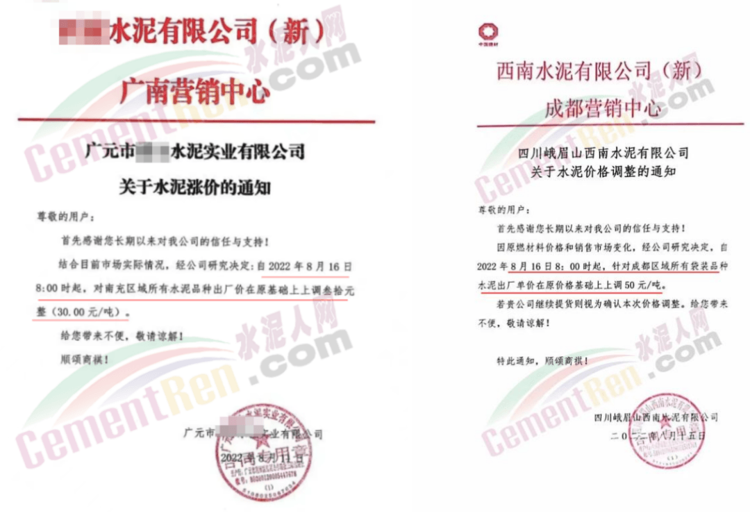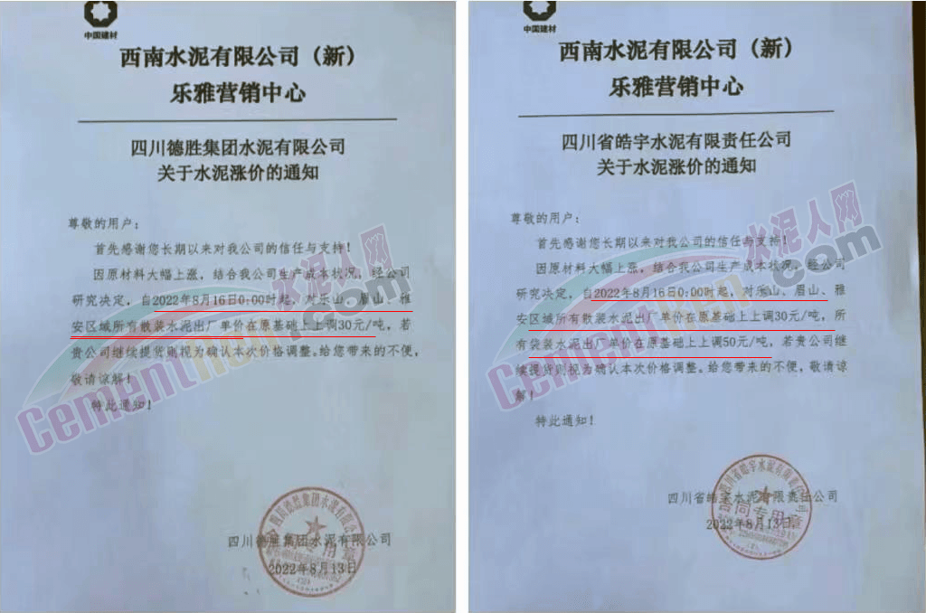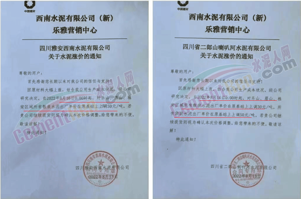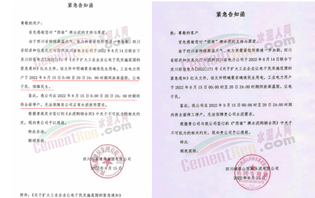四川区域西南水泥旗下两家企业发《紧急告知函》称,由于四川省持续高温天气,电力供需紧张形势进一步加剧,四川省经济和信息化厅与国网四川省电力公司联合下发红头文件。要求确保民生用电,工业电力用户于2022年8月15日0:00至20日24:00时期间放高温假,让电于民、保障民生。鉴于此,公司将全面停产,且无法保障客户正常水泥使用需求。