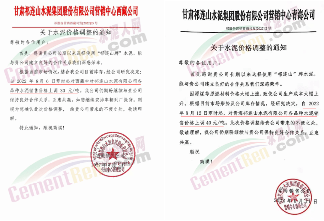 甘肃祁连山水泥青海区域上调40元/吨,西藏区域上调30元/吨。