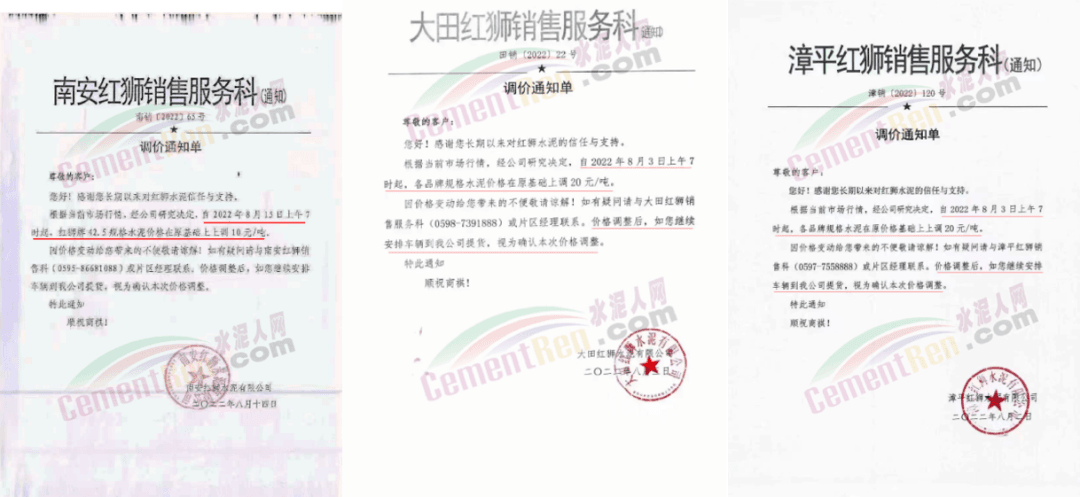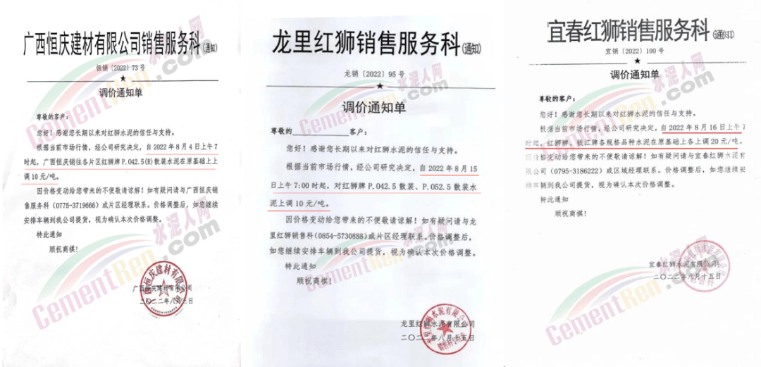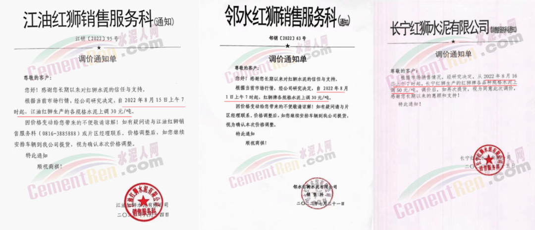 红狮水泥广西恒庆建材水泥格上调10元/吨;四川江油红狮、邻水红狮水泥价格上调30元/吨,长宁红狮上调50元/吨;贵州龙里红狮上调10元/吨;福建南安红狮上调10元/吨,漳平红狮、大田红狮水泥上调20元/吨;江西宜春红狮上调20元/吨。