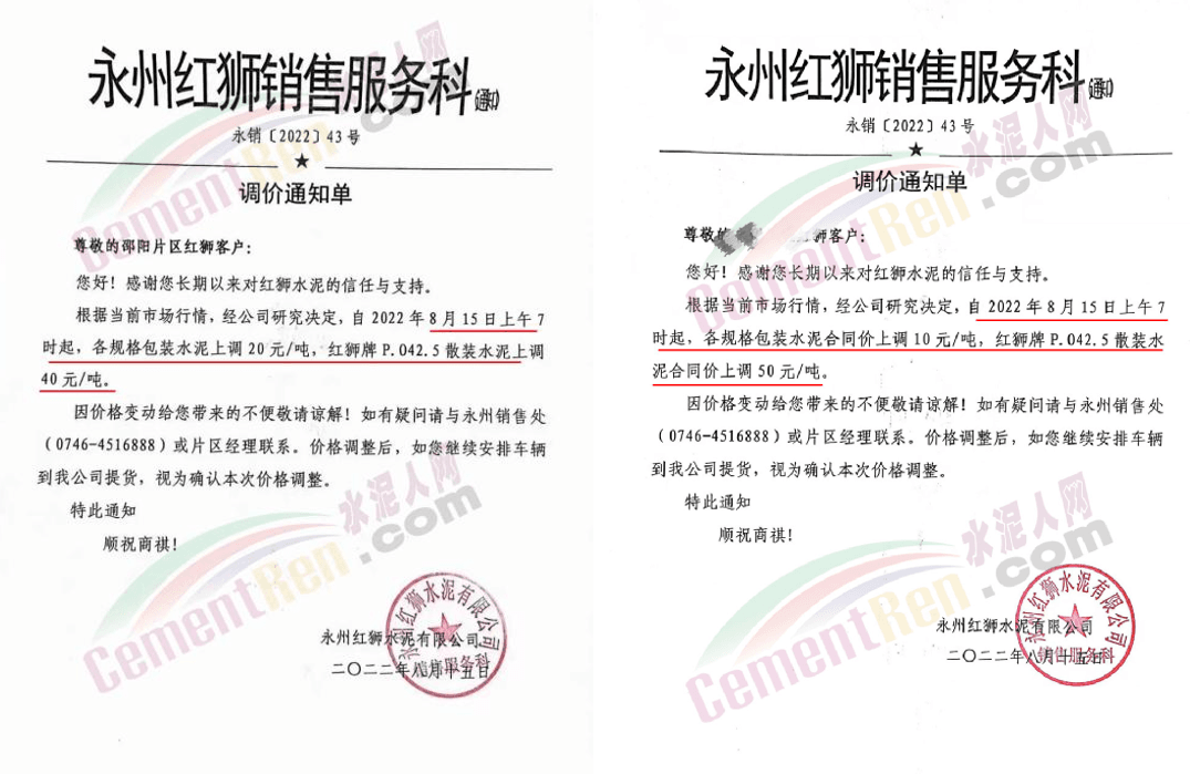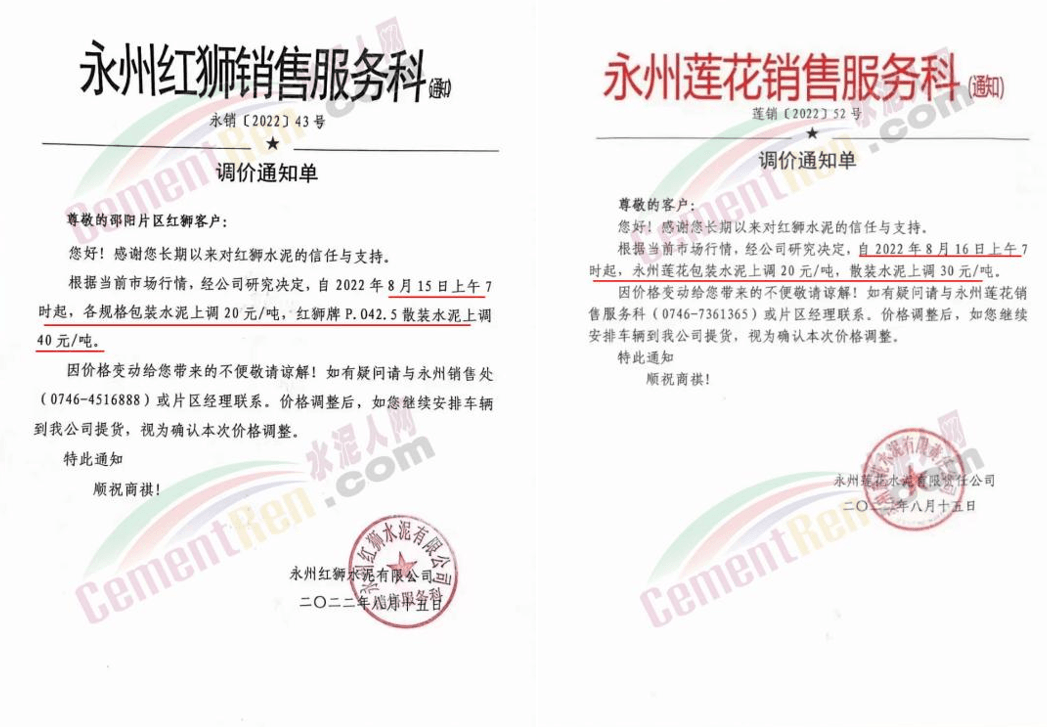 湖南永州红狮针对不同片区包装水泥上调10-20元/吨,P.O42.5散装水泥上调30-40元/吨;永州莲花包装水泥上调20元/吨,散装水泥上调30元/吨。