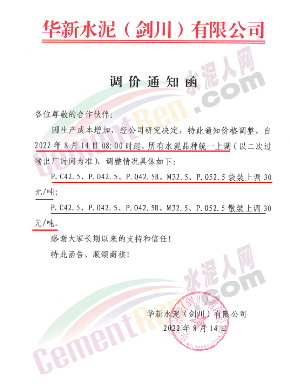 云南华新剑川工厂水泥价格上调30元/吨