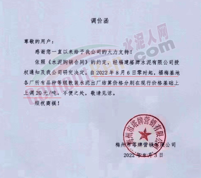 塔牌福梅基地上调水泥价格20元/吨。