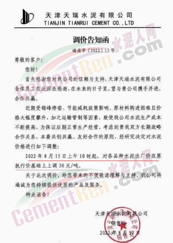 天津天瑞上调水泥价格30元/吨。