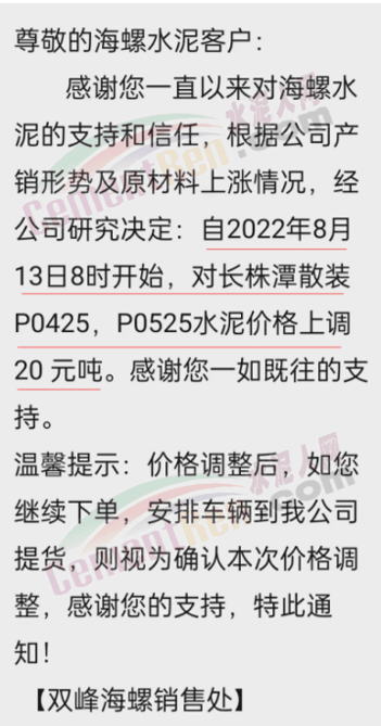 据水泥人网了解,海螺水泥在多区域都与当地企业同步上调了水泥价格,且多数通过电话,短信等方式通知下游客户。其中双峰海螺通知长株潭散装水泥价格上调20元/吨。