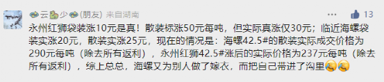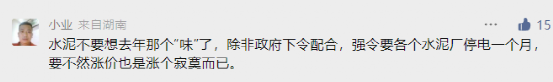 对于近期大面积的价格调涨,另一位来自于湖南区域的网友表示,水泥不要想去年那个“味”了,除非强令要各个水泥厂停电一个月,要不然涨价也是涨个寂寞而已。