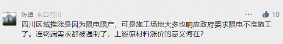来自四川的网友提出疑问,四川区域推涨是因为限电限产,可是施工场地大多也响应政府要求限电不准施工了。连终端需求都被遏制了,上游原材料涨价的意义何在?