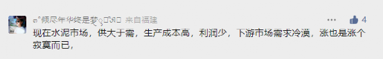 福建网友表示,现在水泥市场,供大于需,生产成本高,利润少,下游市场需求冷漠,涨也是涨个寂寞而已。