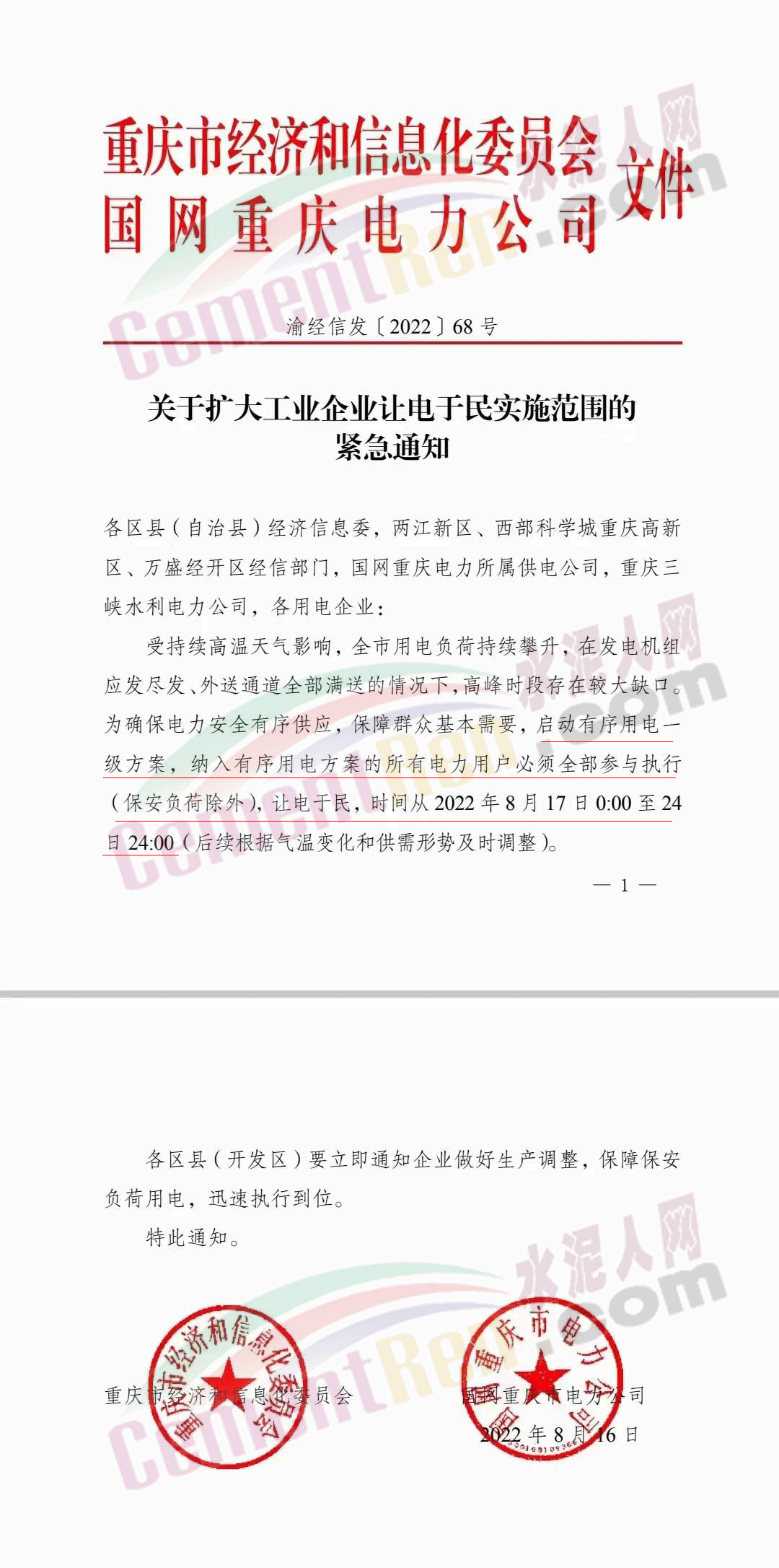 重庆市经济和信息化委员会、国网重庆电力公司联合发布紧急通知要求启动有序用电一级方案,纳入有序用电方案的所有电力用户必须全部参与执行(保安负荷除外),让电于民,时间从2022年8月17日0∶00至24 日24∶00。