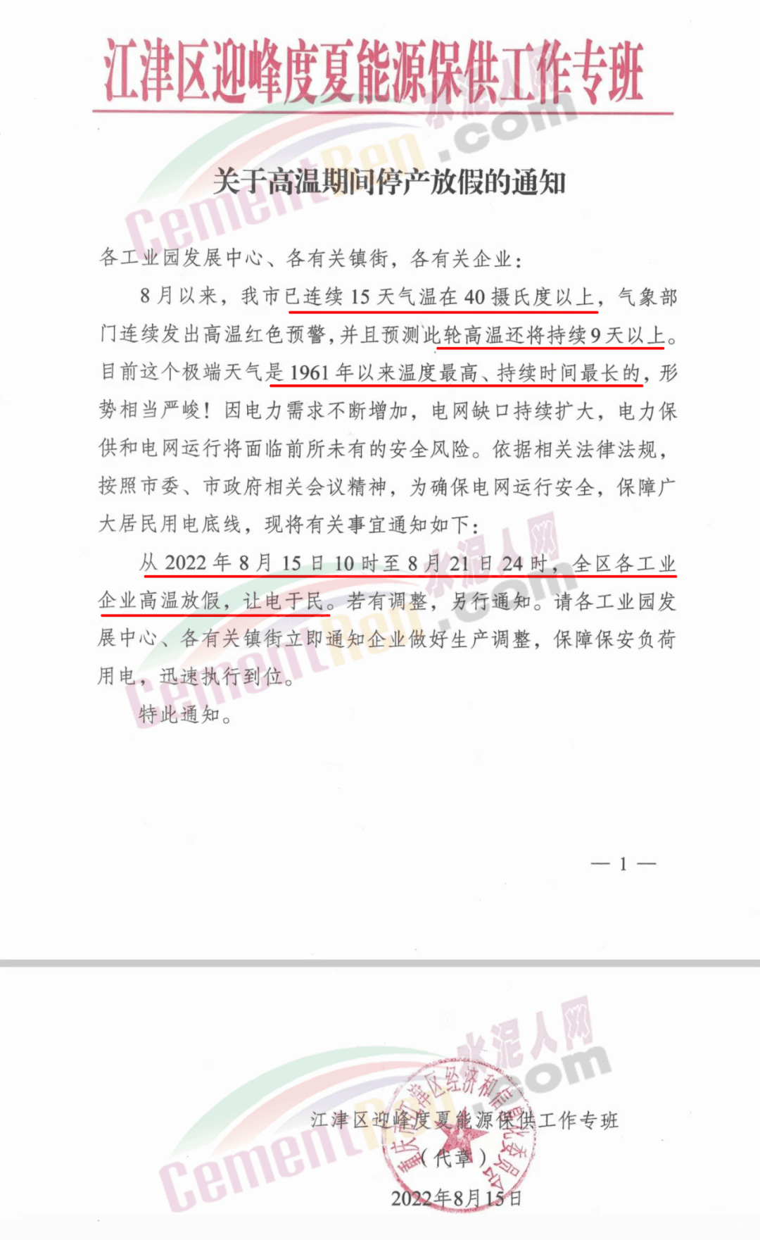 江津区迎峰度夏能源保供工作专班发文要求从2022年8月15日10时至8月21日24时,全区各工业企业高温放假,让电于民。