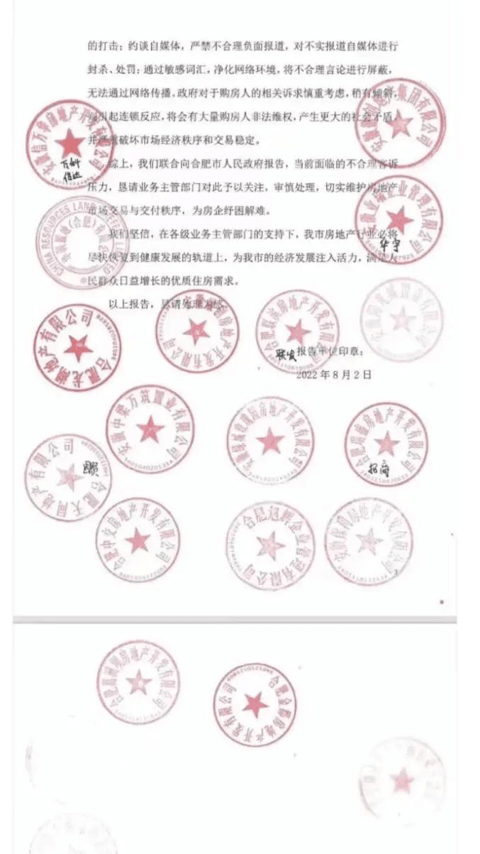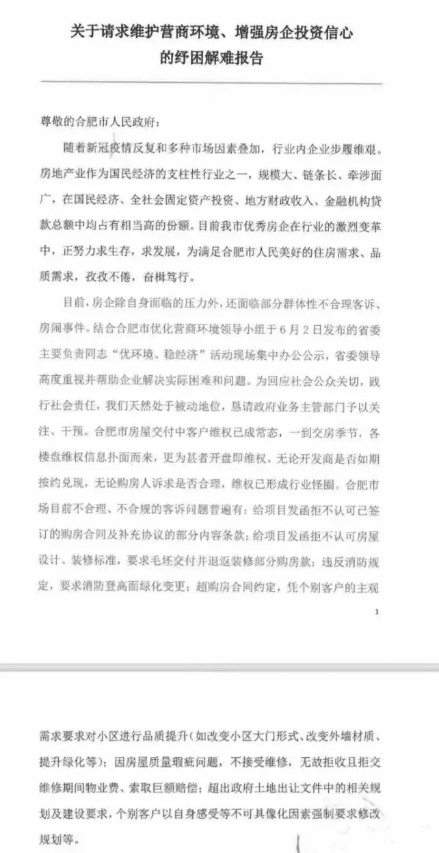 近日,一份写给合肥市政府的、名为《关于请求维护营商环境、增强房企投资信心的纾困解难报告》的文件流出,落款处盖着保利、华润、绿城、龙湖、融创、旭辉和葛洲坝等17家品牌房企的印章。报告请求合肥政府:坚决遏制专业房闹及种种“恶意维权”行为。