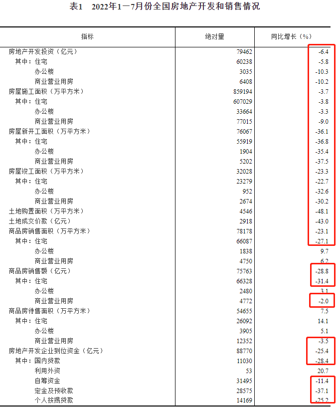 2022年下半年已开启,全国楼市仍处于艰难寻底中,且下行态势严峻。近日国家统计局发布7月份房地产相关数据,所有指标全部下跌。