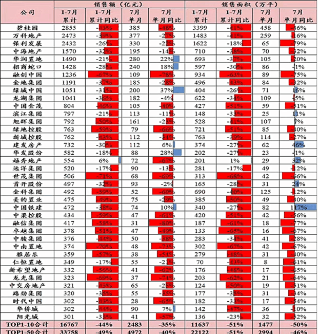 1—7月份,商品房销售面积78178万平方米,同比下降23.1%;商品房销售额75763亿元,下降28.8%,7月末,商品房待售面积54655万平方米,同比增长7.5%。