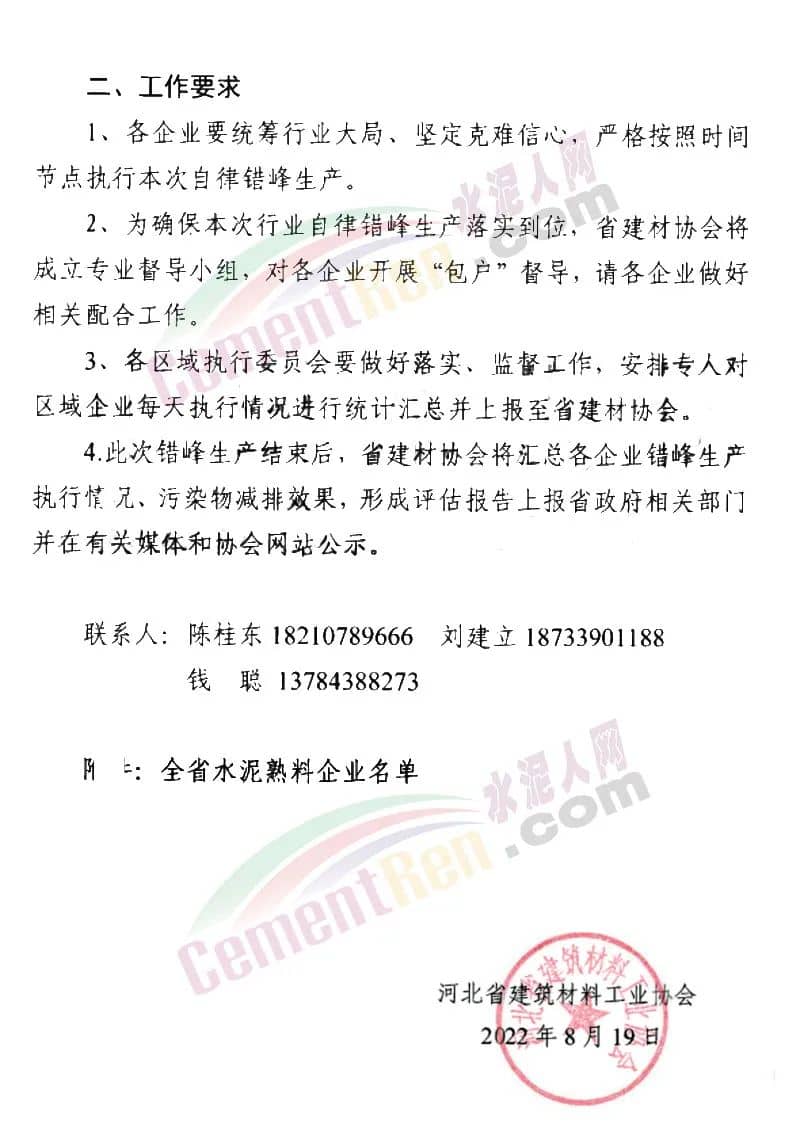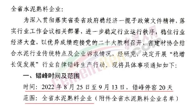 企业开展稳增长促发展行业自律错峰生产的通知》,是覅有河北全省水泥熟料企业自2022年8月25日~9月13日,错峰停窑20天。