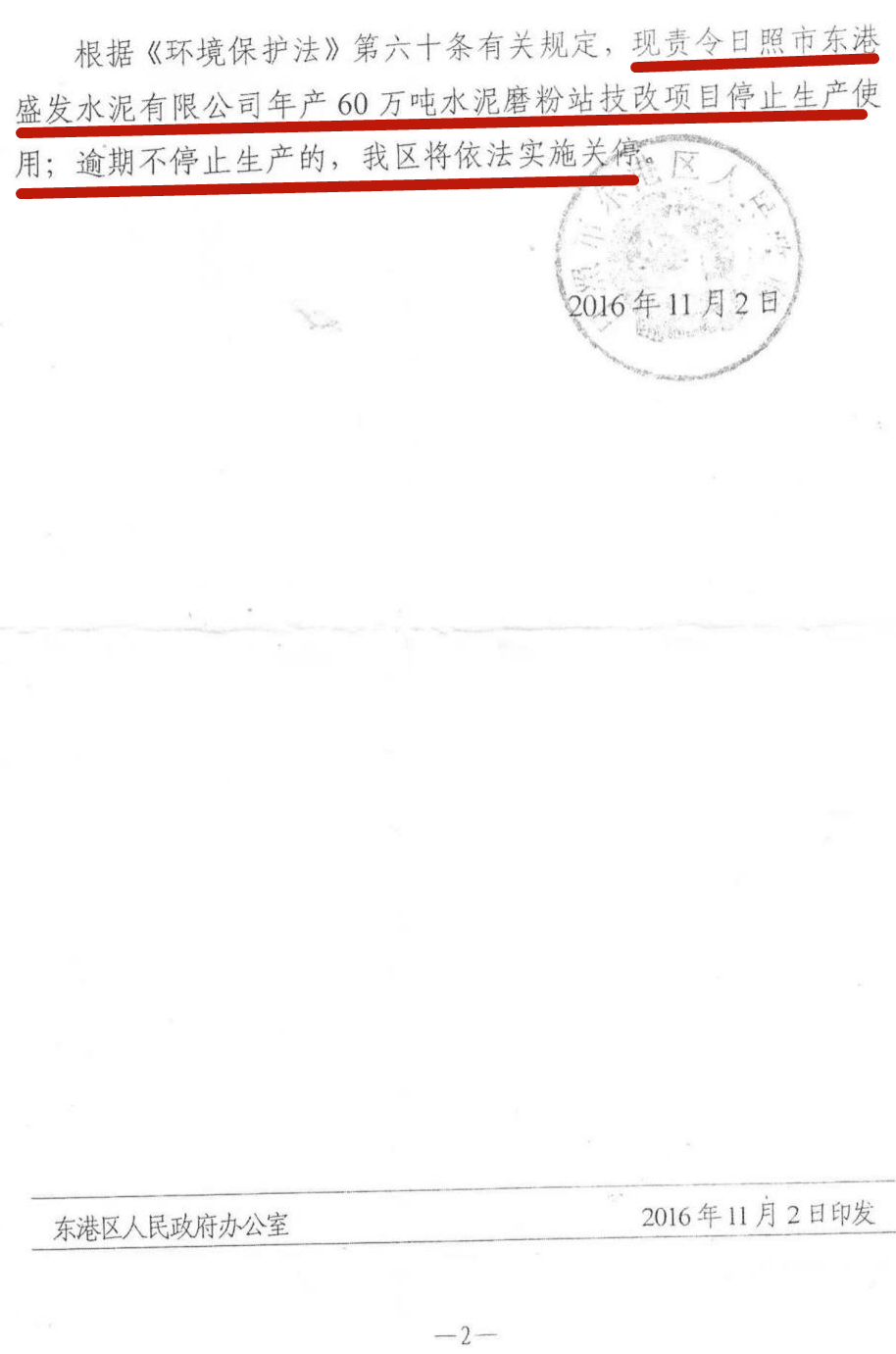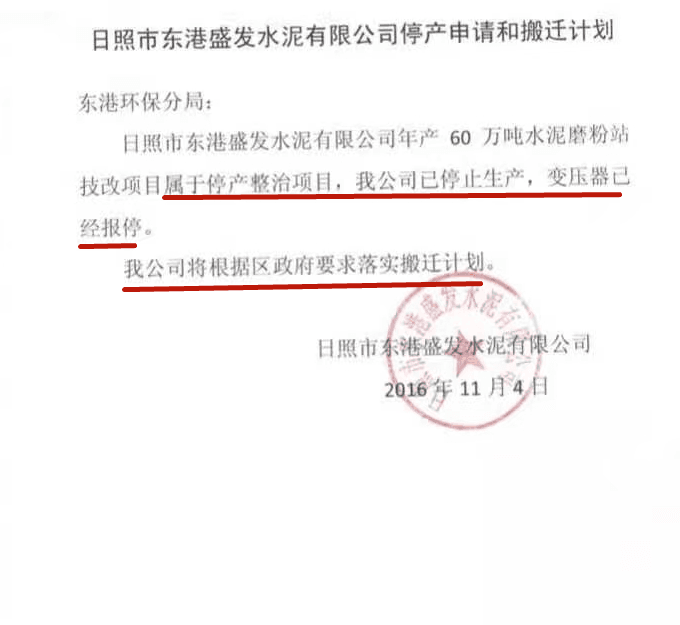 倒推时间轴,政府文件为证,2016年11月2号日照市东港区政府责令盛发停止生产的通知,11月4号企业上报区环保分局,明确:我公司将根据区政府要求落实搬迁计划。