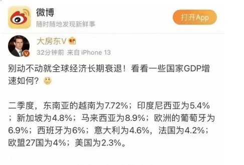 但是,对于部分媒体和吃瓜群众在强调的“全球经济衰退”,有人是不同意的。新浪博主@大房东表示:别动不动就全球经济长期衰退,看看一些国家GDP增速如何?
