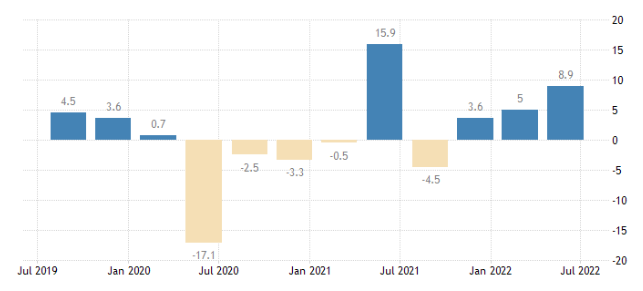 8月15日周一,日本内阁府公布2022年二季度GDP数据,二季度实际GDP季环比增速初值为0.5%,较上一季度反弹,一季度数值由-0.1%修正为0%;二季度实际GDP年化季环比初值为2.2%,低于经济学家预期的2.5%,一季度数值由-0.5%修正为0.1%。二季度数据反弹,主要是由于私人消费的反弹。数据显示,日本二季度私人消费季率初值增长1.10%,市场预期为1.30%,前值0.10%。