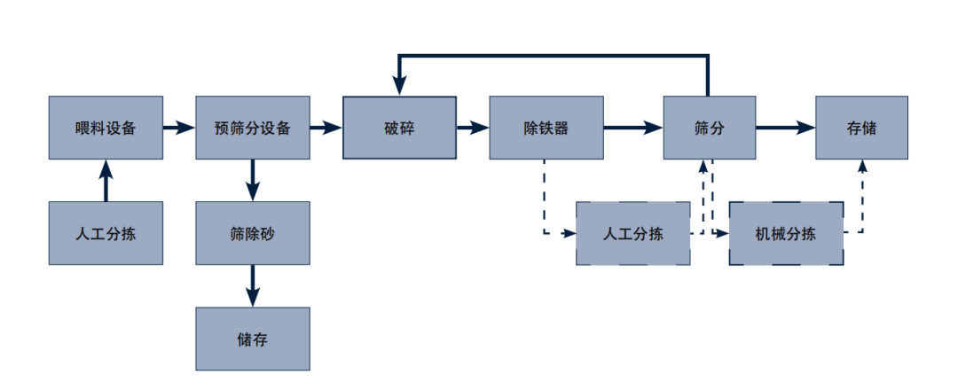 对于破碎工序,在破碎过程中,有些原料混合了铁质金属杂质,具有很高的磨蚀性,这就要求破碎设备必须能够适应此类原料;同时,原料的粒度也有很大的波动范围,例如长度超长的混凝土梁柱,破碎机的设计必须能够适应此类原料的变动,否则就可能面临设备损坏或生产线停工的后果。