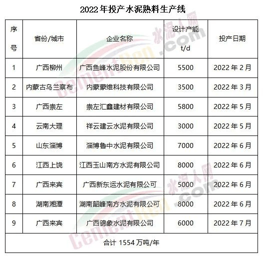 据水泥人网不完全统计,截至目前年内共投产水泥熟料产线9条,合计熟料产能1554万吨。仅广西区域就有4条水泥熟料生产线,熟料产能合计达669万吨/年。
