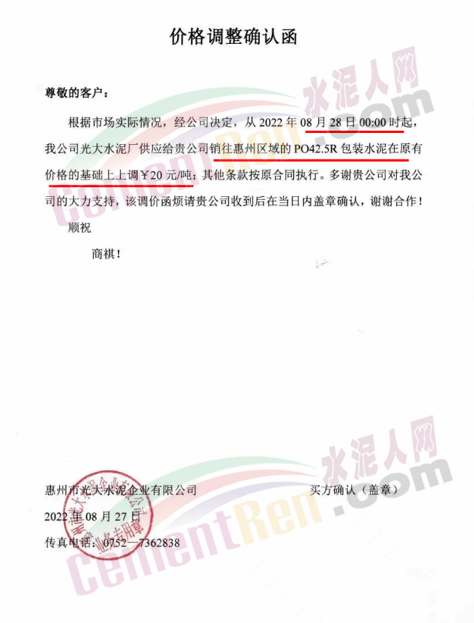 水泥人网消息:惠州光大水泥通知自8月28日0时起销往广东惠州区域的P.O42.5包装水泥上调20元/吨。