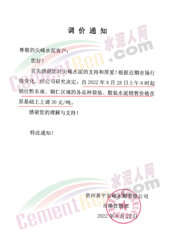 同日,贵州区域多家企业通知上调水泥价格。黄平尖峰水泥通知自8月28日上午8时起销往黔东南、铜仁区域水泥价格上 调30元/吨。