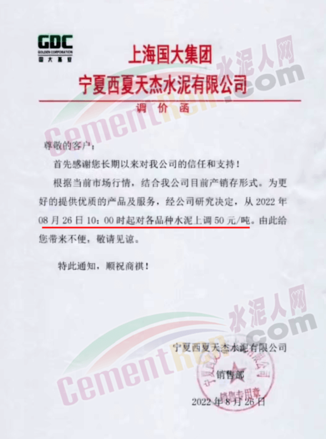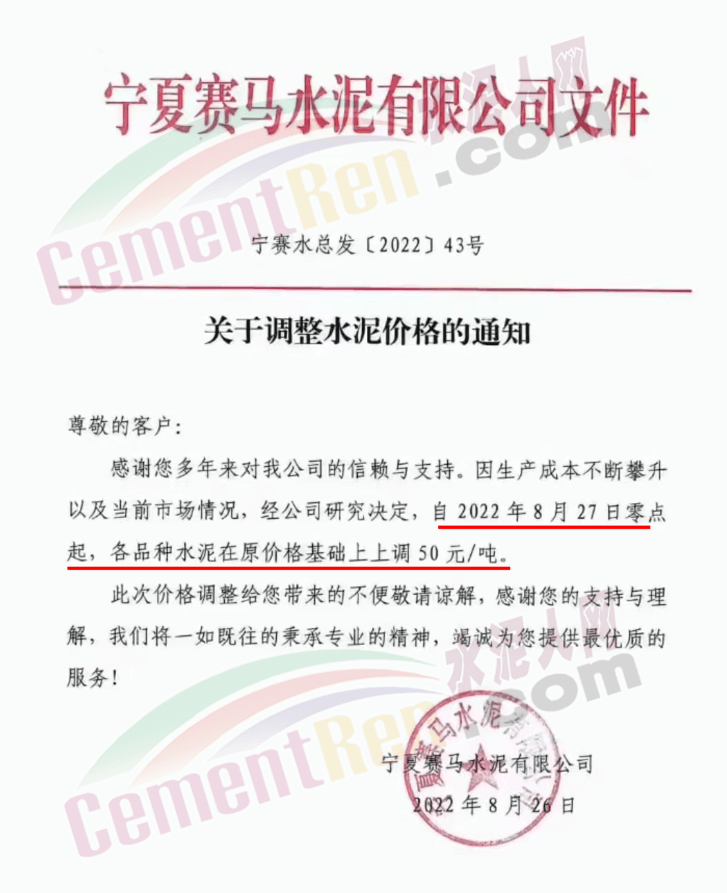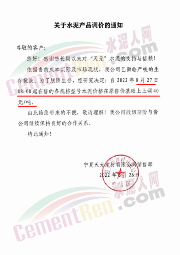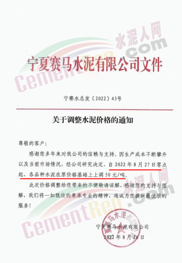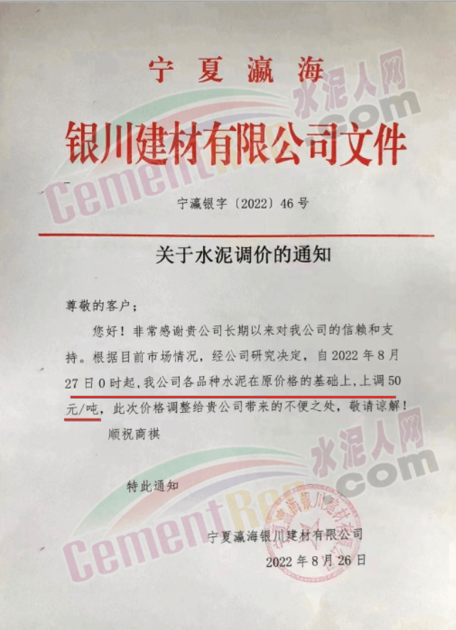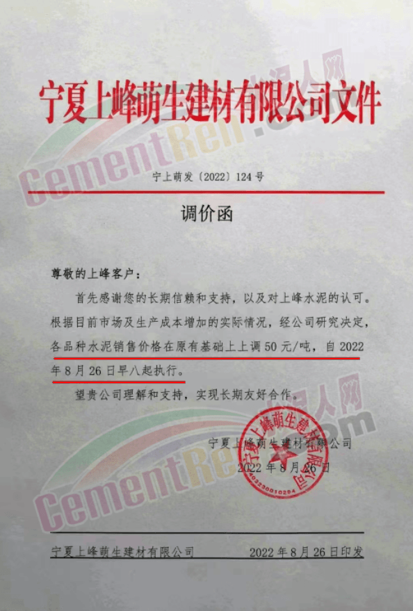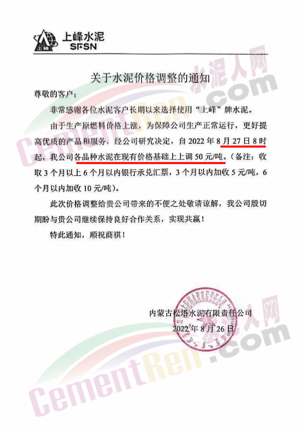 内蒙古松塔水泥通知,8月27日8时起各品种水泥价格上调50元/吨。