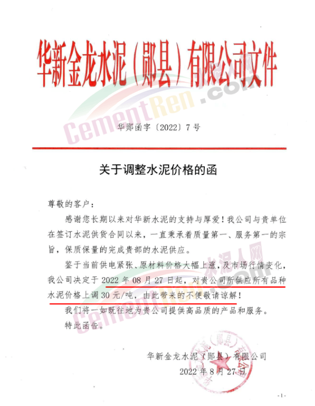 位于湖北省十堰市的华新金龙水泥(郧县)公司通知,鉴于当前供电紧张、原材料价格大幅上涨,及市场行情变化,公司决定于2022年08月27日起,对所有品种水泥价格上调30元/吨。