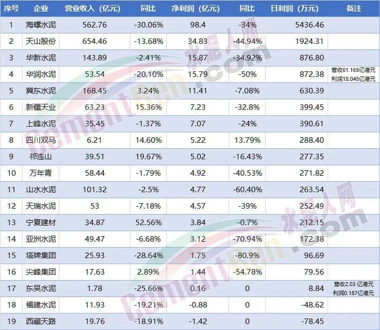 截止目前,已发布上半年业绩公告的19家水泥上市公司西藏天路,福建水泥出现亏损;尖峰水泥下滑超五成,山水水泥下滑超六成、亚洲水泥下滑超七成、塔牌水泥下滑达80.9%……