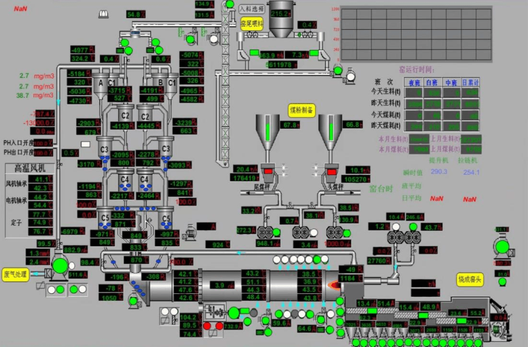 最近的一条标准设计的5000t/d生产线,在两年前就全部打开三次风管阀门运行的基础上,采用了“节能型低氮燃烧器”,把喷煤管定位在中心线以上进行运行,再次取得了降低热耗,提高产量,提高熟料强度,降低高温风机转速和电流的明显效果。并且在产量达到7000t/d的工况下,一级旋风筒出口的压力只有5000pa。创造了同类型同规格预热器的最低压力和最低的热耗。该生产线的运行界面如下: