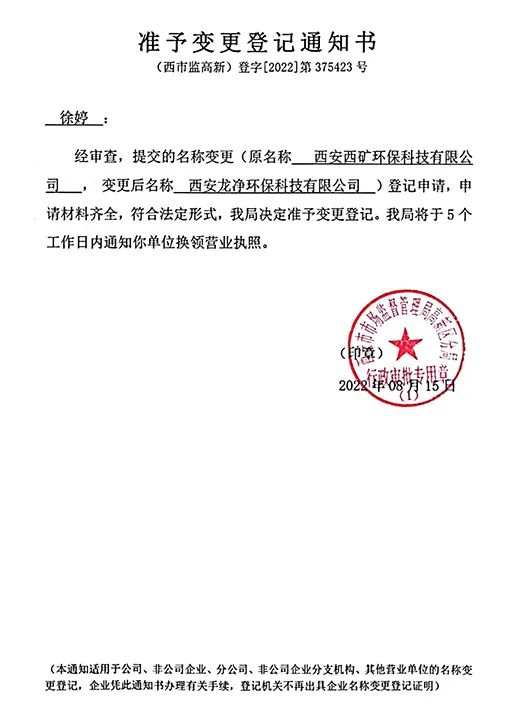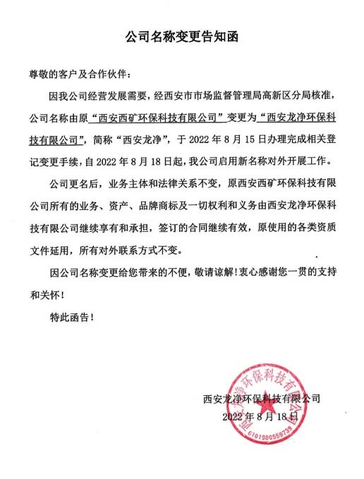 因企业经营发展需要,经西安市市场监督管理局高新区分局核准,企业名称由原“西安西矿环保科技有限公司”变更为“西安龙净环保科技有限公司”,简称“西安龙净”,于2022年8月15日办理完成相关登记变更手续,自2022年8月18日起,企业启用新名称对外开展工作。