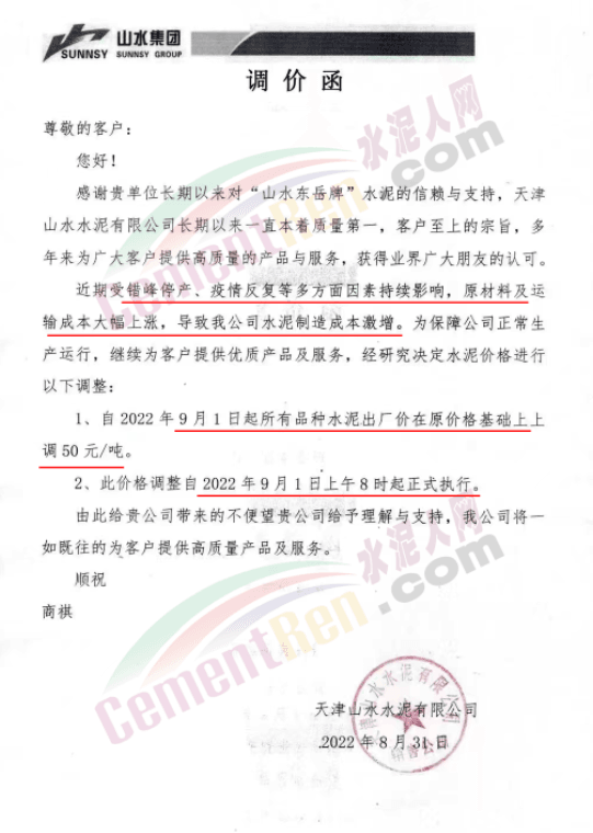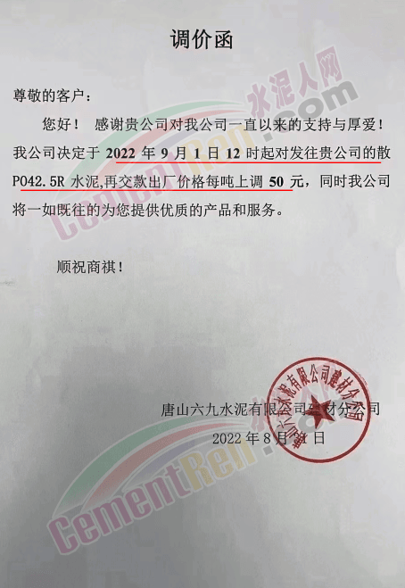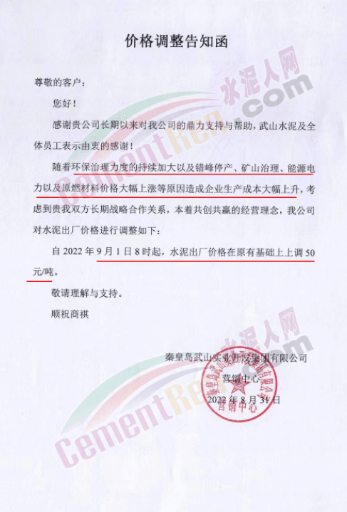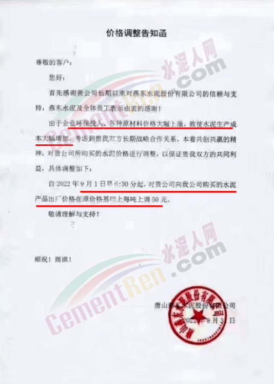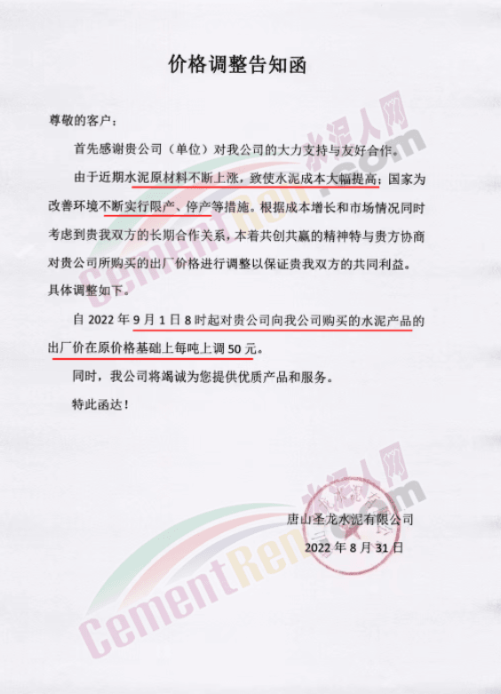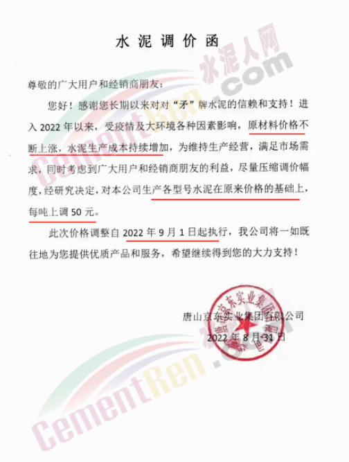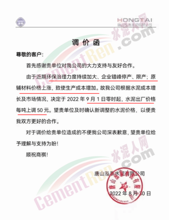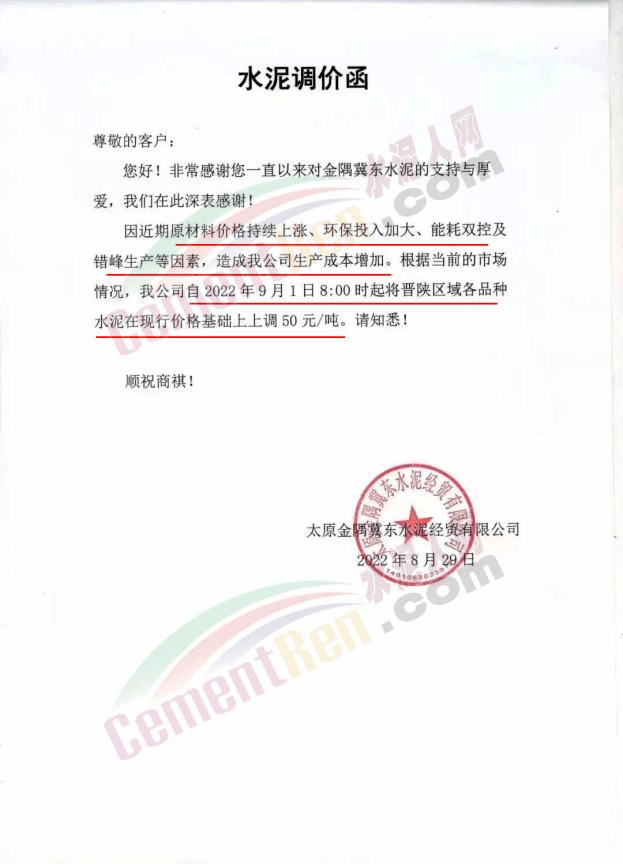 日前,太原金隅冀东水泥经贸有限公司通知,因近期原材料价格持续上涨、环保投入加大、能耗双控及错峰生产等因素,造成公司生产成本增加。根据当前市场情况,自9月1日8时起晋陕区域各品种水泥在现行价格基础上上调50元/吨。