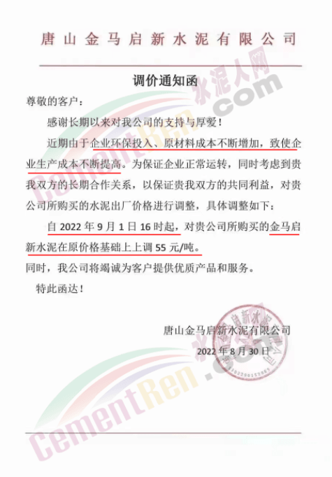 唐山冀东、泓泰、六九、圣龙、金马启新、京东、天津山水、秦皇岛武山等水泥企业通知由于环保投入、各种原材料价格大幅上涨,致使水泥生产成本大幅增加。水泥价格自9月1日起上调50元/吨。这是继8月份以来的第二次涨价,也是9月的第一轮上涨。部分企业累计上涨已达100元/吨以上。