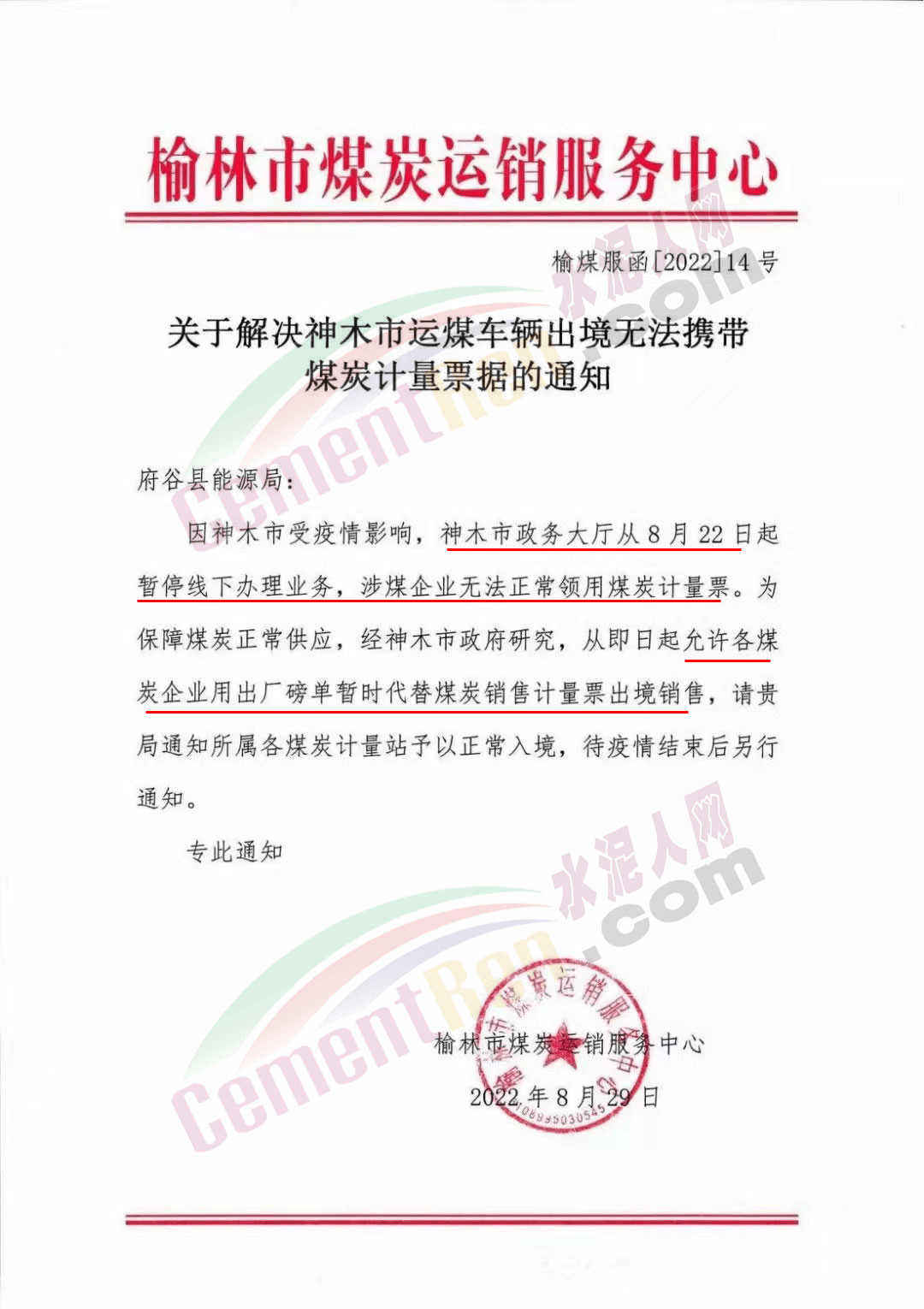 日前,榆林市煤炭运销售服务中心通知,因神木市受疫情影响,神木市政务大厅从8月22日起暂停线下办理业务,涉煤企业无法正常领用煤炭计量票。为保障煤炭正常供应,经神木市政府研究,从即日起允许各煤炭企业用出厂磅单暂时代替煤炭销售计量票出境销售。