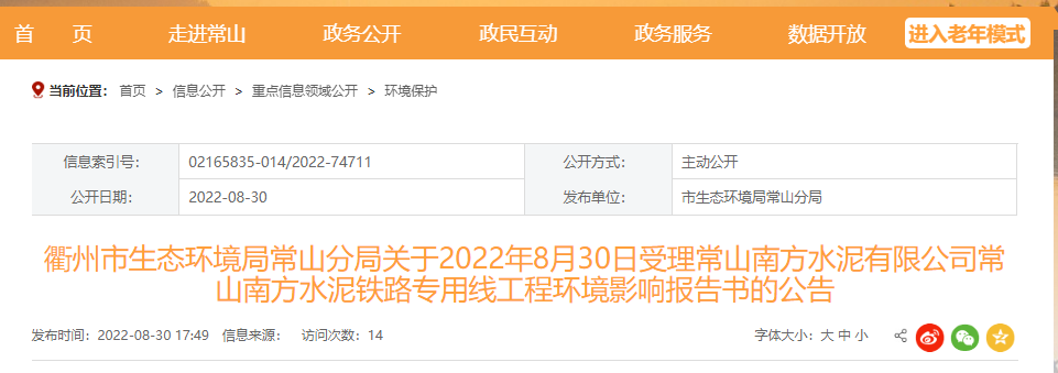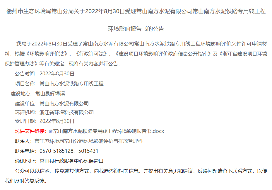 浙江省衢州市生态环境局常山分局发布《关于2022年8月30日受理常山南方水泥有限公司常山南方水泥铁路专用线工程环境影响报告书的公告》