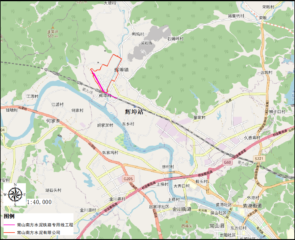 2022年5月19日,浙江省发展和改革委员会核准了本工程,项目名称“常山南方水泥铁路专用线工程”,项目代码2205-330000-04-01-161771。本工程在现有铁路九景衢铁路的辉埠站九江端接轨,沿九景衢铁路的北侧向西布线至厂区,全长约1.79km,采用专用线标准。辉埠站九江端约270m范围调整轨道增设道岔,辉埠站与厂区之间约345m新建专用线,进厂后利用预留用地设厂区站。厂区站用于原煤卸车和水泥装车。本专用线设计运量为170万吨/年,本次专用线工程不改变厂区原有产能。