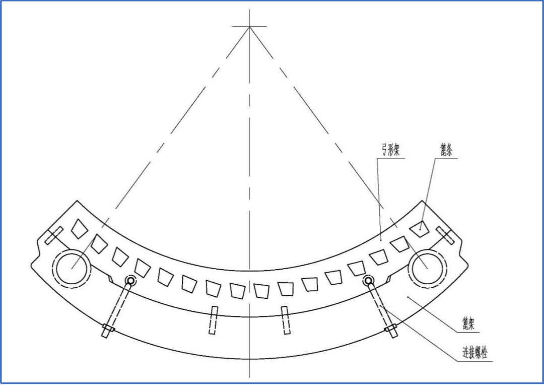 如图1所示,篦架上部分由弓形架、篦条、连接螺栓等部分组成。其中弓形架为t=30mm的钢板下料而成。弓形架的外圆与篦架的内圆相配合、定位,再通过连接螺栓固定弓形架。弓形架侧面有梯形孔,通长的锻件篦条从四片弓形架的梯形孔中穿过,端面再以钢板焊接形式封堵。