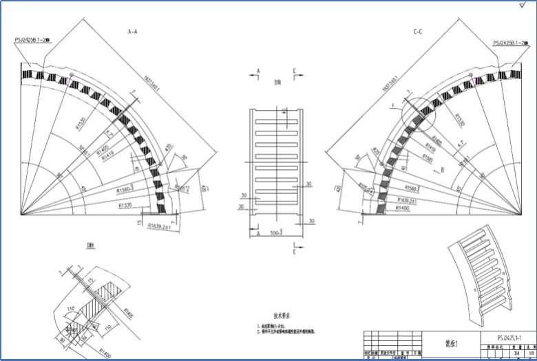 1.因弓形板与篦条改为整体铸件形式,篦条的截面与弓形板的厚度需要重新调整,篦条的截面形状为倒梯形,尺寸在原有基础上适当增大。每两块篦板间的连接板原为t=30mm的钢板,修改后每两块篦板间的厚度增加了一倍,如尺寸保持不动的话,破碎机转子的锤头与两篦板的接口位置干涉,需要降低每两块篦板间的侧板高度,与篦条保持同一高度,修改设计后的图纸请见图3。