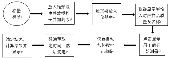 称量一定量的样品,将其倒入150ml锥形瓶中,加上30ml的乙二醇-无水乙醇溶液,放入搅拌子,然后放入仪器中对应位置,装上冷凝管,使得锥形瓶与冷凝管紧密连接,在仪器显示屏对应的位置输入称取的样品质量及样品名称,点击开始测量,仪器会自动进行搅拌、加热、萃取、滴定及结果计算,如图2。