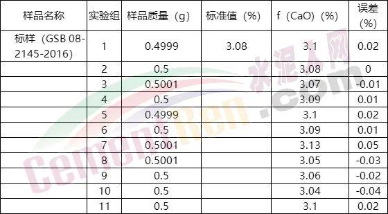 从上表数据可看出,仪器测量结果与标准值误差在T/C BMF17-2017《 水泥生产企业质量管理规程》规定的同一实验室允许的误差范围内(游离氧化钙测定误差±0.20%,与国家标准样品对比),重复性在GB/T 176-2017《水泥化学分析方法》规定的范围内。